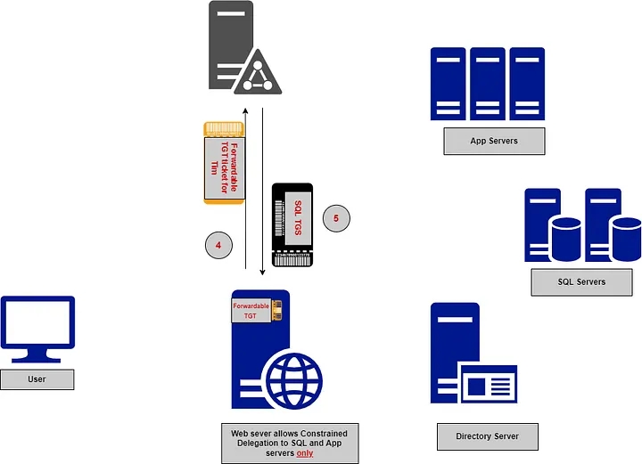 To understand the authentication flow, let’s take an example of a user authenticating to a constrained delegated account like a web service account that only allows delegation to SQL services. The authentication flow would consist of five(5) main steps.